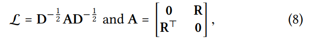 adjacency matrix는 R과 R의 전치행렬 그리고 좌측 상단에는 NxN 0행렬 우측 하단에는 NxN의 0행렬이 존재한다. 각각의 행은 순서대로 user_1 부터 user_N, item_1부터 item_N 까지를 나타낸다고 볼 수 있다. 0행렬들이 포함되는 이유는 행렬 곱으로 나타낼 때 포함될 정보와 포함되지 않을 정보들을 고르기 위함이다. NGCF는 bipartite graph의 구조를 이용해서 higher order connectivty를 얻는 게 목적이므로 행렬 곱으로 인해 user와 user, item과 item의 정보가 직접적으로 이어져서는 안된다.