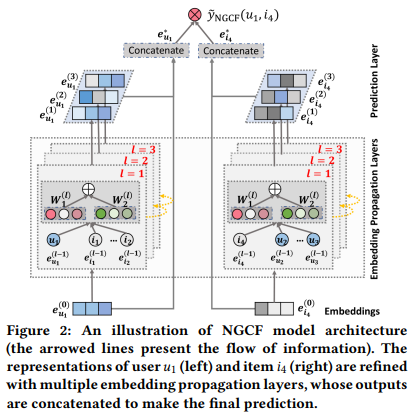 Embedding Propagation Layer의 그림이다. 전체적인 흐름을 살펴보면 먼저 user에 대한 feature와 user에게 추천할 item에 대한 feature가 각각 들어가서 3번의 embedding propagation 과정을 거친다. embedding propagation 과정은 higher order connectivuty의 순서에 맞게 진행됨을 알 수 있고 l=1, l=2, l=3 각각에서 나온 embedding을 concatenation해서 사용한다. concatenation해서 완성된 user와 item 각각에 대한 final embedding은 y_NGCF라는 것을 통해 score로 계산되는데 이는 단순한 내적을 의미한다.