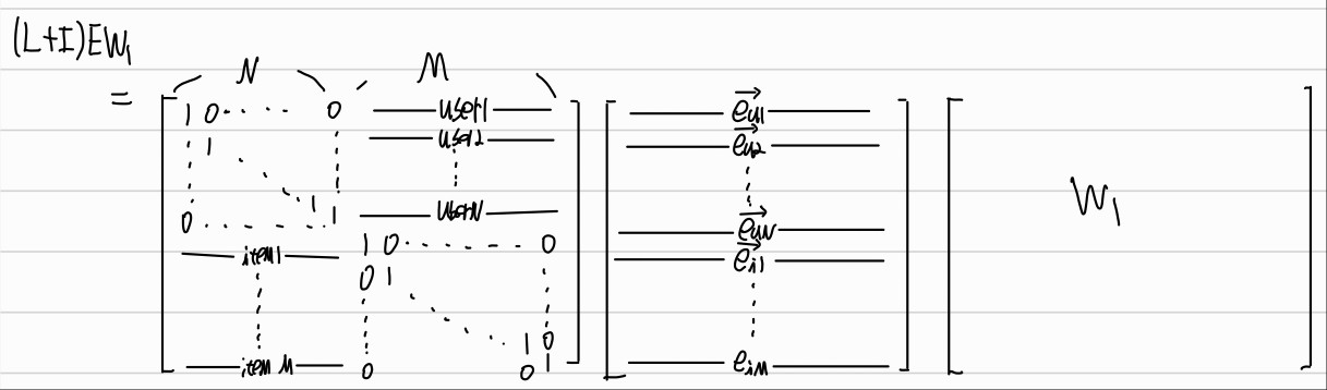 각각의 행이 노드의 feature를 뜻하고 N개의 user의 feature는 이전 layer의 M개의 item중 연결된 노드 와의 emebdding으로만 구성되고 M개의 item에 대한 embedding은 이전 layer의 N개의 user 중 연결된 노드와의 embedding으로만 구성된다.