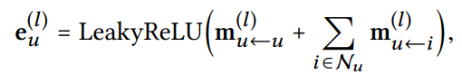 l번째 embedding propagation layer에서 생성되는 e_{u}의 embedding이다. m_{u<-u}, 이전 layer의 u에서 현재 layer의 u로 가는 message가 추가된 것을 알 수 있다. 이때 이전 layer에 곱해지는 가중치 W1은 이전 layer의 e_{i}에 곱해지는 가중치 W1과 공유된다. P_ui는 Normalization 을 간략하게 나타낸 것이다. Leaky ReLU를 사용한 이유는 element-wise product로부터 강조된 유사성은 큰 양의 값을 가지게 될 확률이 높고 다른 점은 0에 가깝거나 음수의 값을 가질 확률이 높은데 양수의 값을 크게 남김으로써 message로 받은 정보 중 유사성을 남기기 위함이라고 생각할 수 있다.