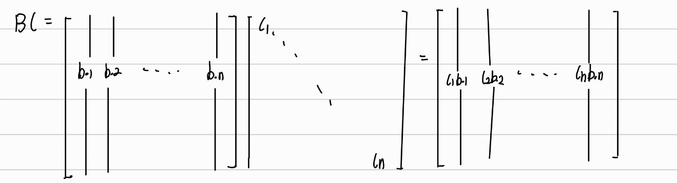 C가 B의 뒤에서 곱해지는 경우 C의 대각원소가 B의 열에 곱해지는 것을 볼 수 있다. 행렬 곱의 결괏 값을 열을 기준으로 살펴 보면 각각의 열은 앞에 오는 행렬의 열의 결합으로 볼 수 있다. C의 첫번 째 열을 살펴보면 c1외에 다시 모든 원소가 0이다 따라서 BC의 첫번째 열은 c1*b.1 + 0*b.2 + .. + 0*b.n = c1*b.1이다.